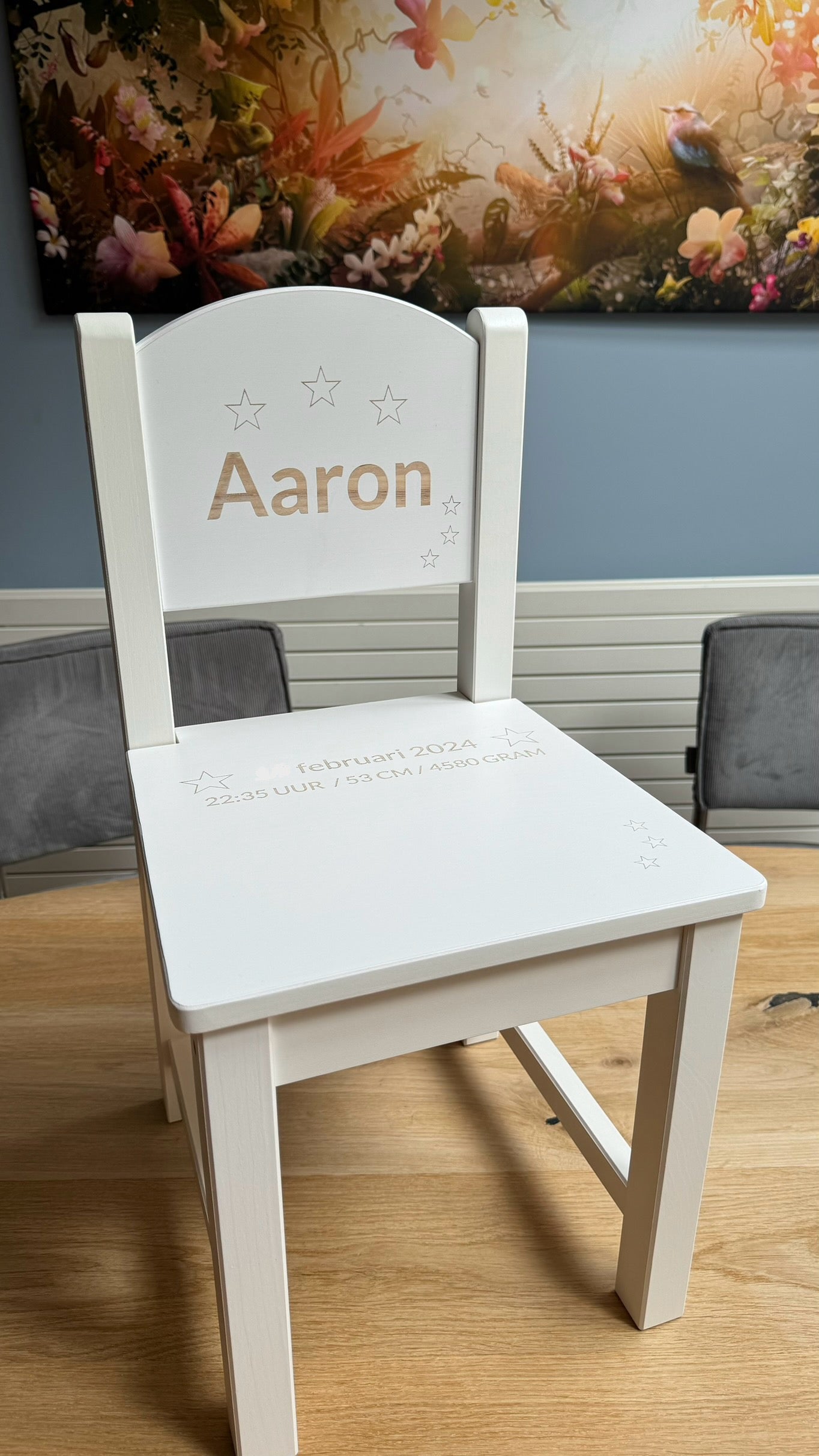 Een uniek en persoonlijk kraamcadeau voorzien van laser gravure op de rugleuning en zitting