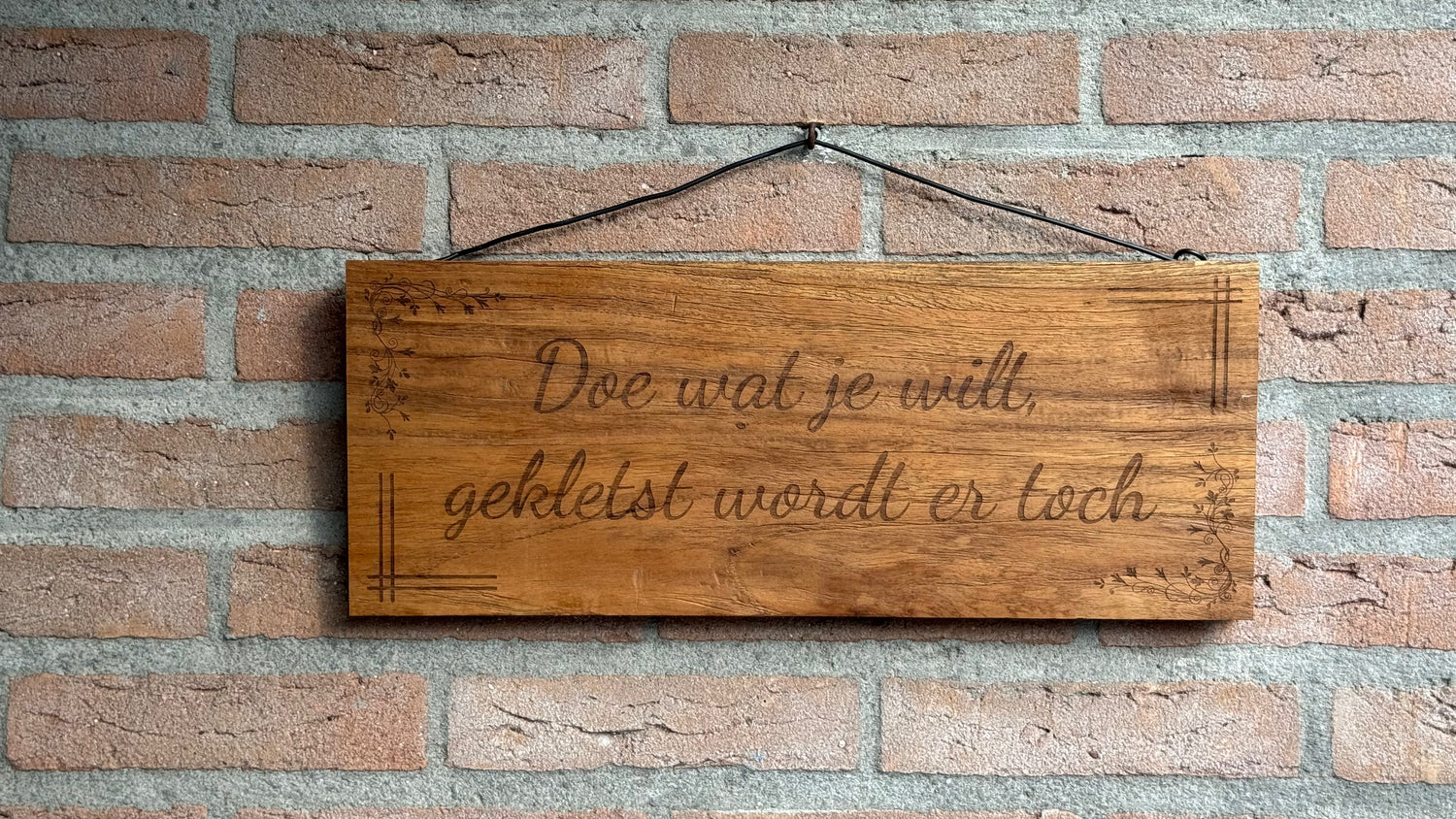 Duurzaam hergebruik van materialen is voor ons erg belangrijk. Wij streven er naar om zo min mogelijk materiaal verloren te laten gaan. Dit wandbord is gemaakt op een stuk van een oude tafel. Zeg nou zelf, gaaf toch?