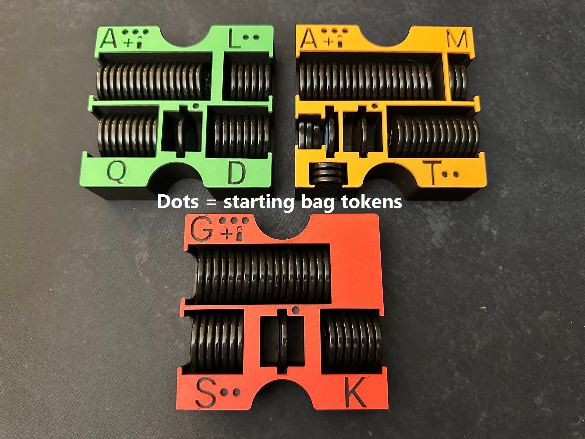 • Ras tokens kleurgecodeerd met stippen die aangeven welke tokens in de draw bag gaan bij aanvang.