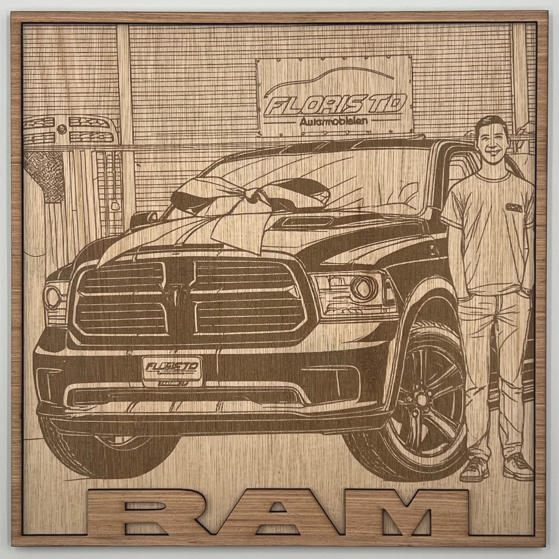 Maak van je favoriete foto van jouw Dodge RAM een blijvende herinnering op hout. We graveren de foto met de laser in een laag hardhout multiplex van 3,6 millimeter. Daarbovenop plaatsen we een tweede laag die als strak kader fungeert zodat het geheel oogt als een ingelijste foto uit één stuk hout.